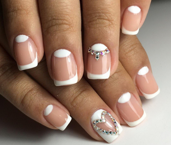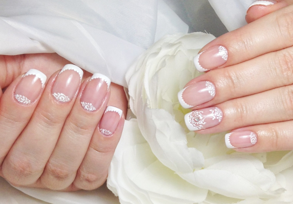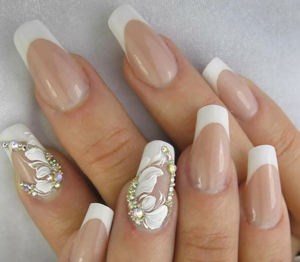 Отлично смотрятся объемные цветы или другие рисунки в белом цвете поверх классического френча.