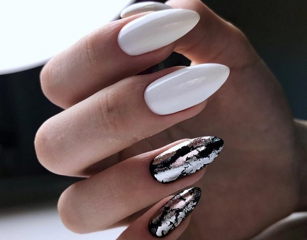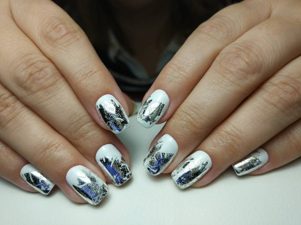 Фольгой можно дополнить лаконичный монохром, рисунки, мраморный узор. Она хорошо сочетается с разной длиной ногтей.