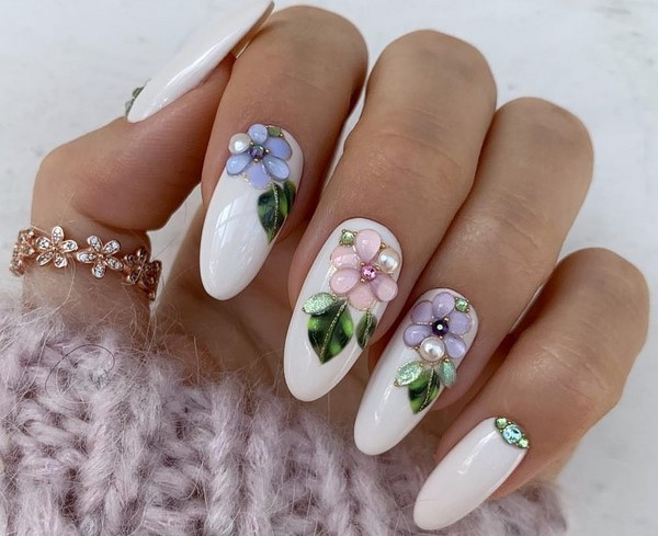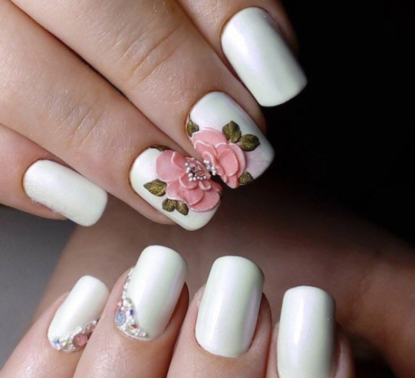 Лепка на белом фоне – один из самых подходящих видов дизайна для праздничного события. Такой объемный маникюр станет отличным вариантом для свадебного образа. Для этого его можно дополнить хрустальной крошкой или стразами.