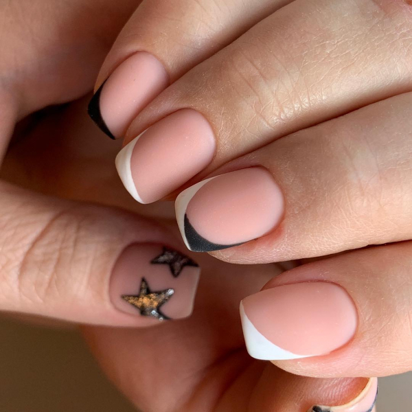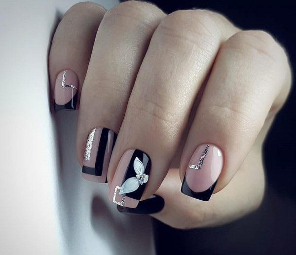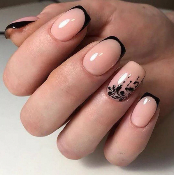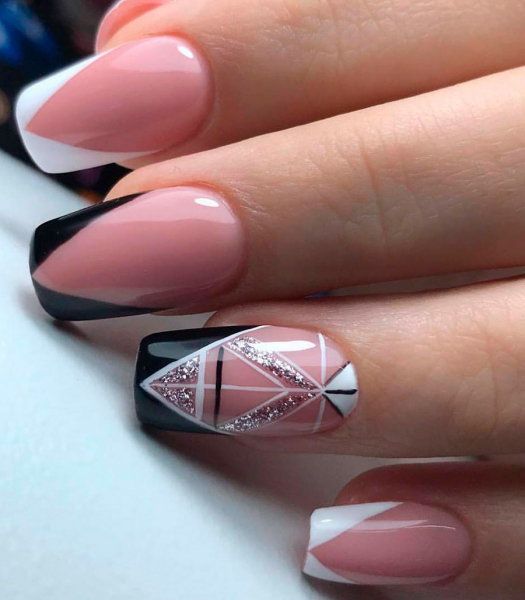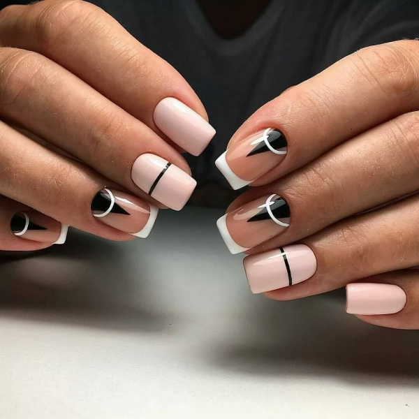 В следующем году популярным будет французский маникюр на квадратных ногтях, сделанный в сочетании с геометрическим стилем. Его будут выполнять яркими гель-лаками или пастельными. Модной будет такая техника в черном цвете.