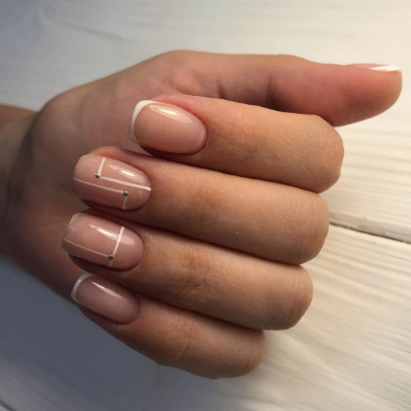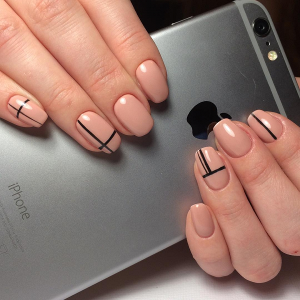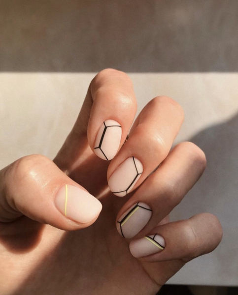 Полоски дополнят геометрический дизайн, цветочный принт, однотонное матовое покрытие, маникюр в стиле negative space.