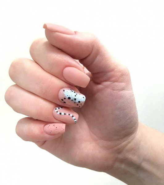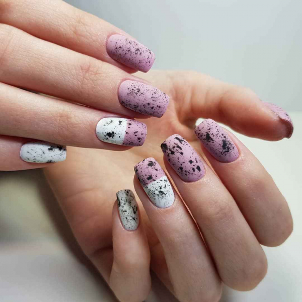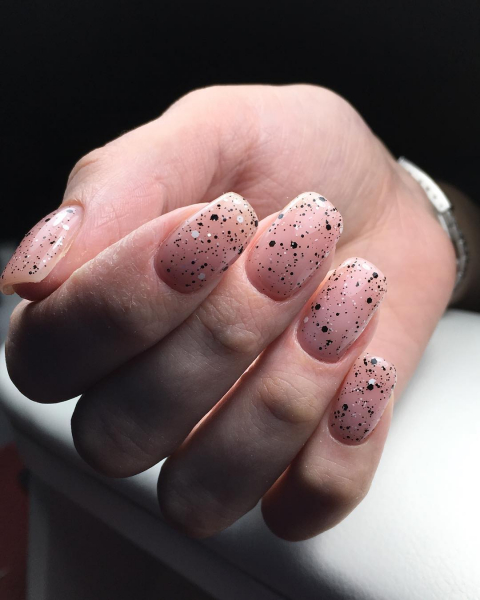 Одним из самых красивых вариантов нейл-арта считается дизайн, напоминающий узор на перепелиных яйцах. Небольшие точки, хаотично расположенные по поверхности ногтя, похожи на брызги краски. Обычно такой узор выполняют черным цветом на пастельном или нюдовом матовом покрытии.
