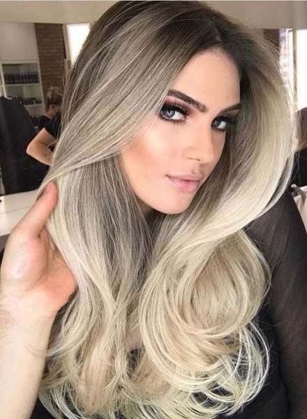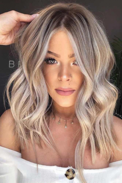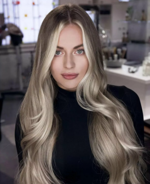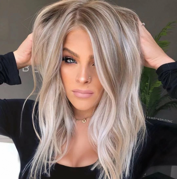 Это замечательный выбор на длинные волосы. Модное окрашивание волос блонд в холодных тонах в 2021 году делает образ незабываемым. При выборе платинового блонда можно смело выбирать брючные наряды, который будут прекрасно гармонировать с локонами.