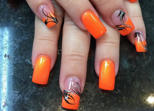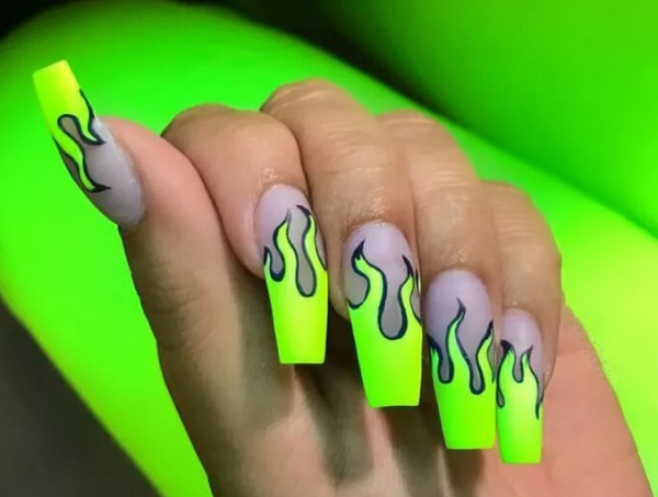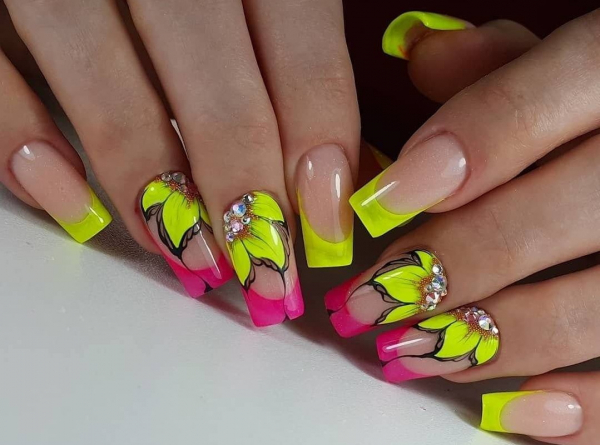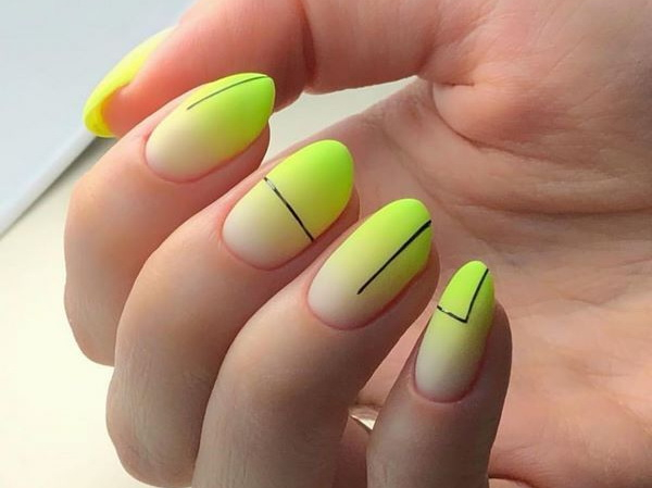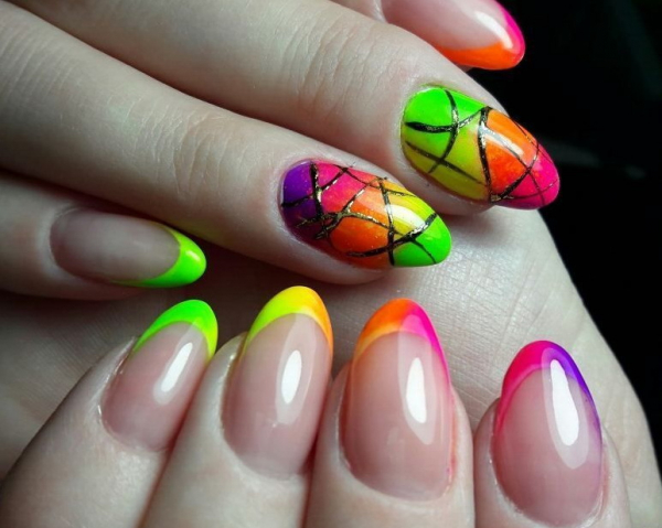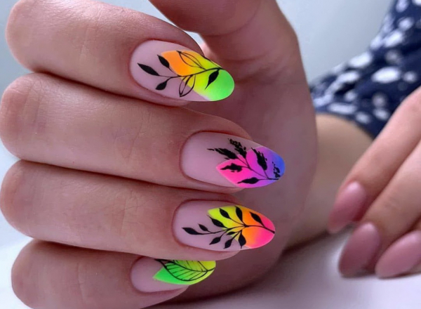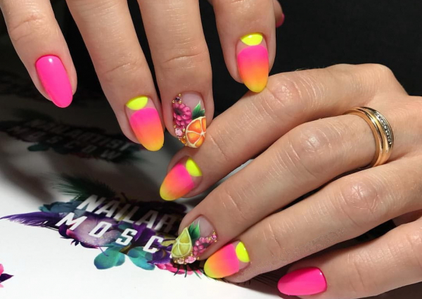 Цветовая палитра в летнем сезоне предпочтительна как можно более яркая. Хорошо смотрятся в сезон отпусков и пляжного отдыха неоновые оттенки лака или градиент (красиво подчеркивают загорелую кожу).