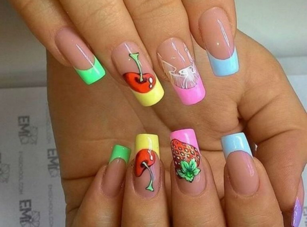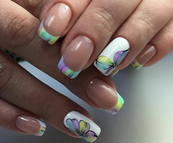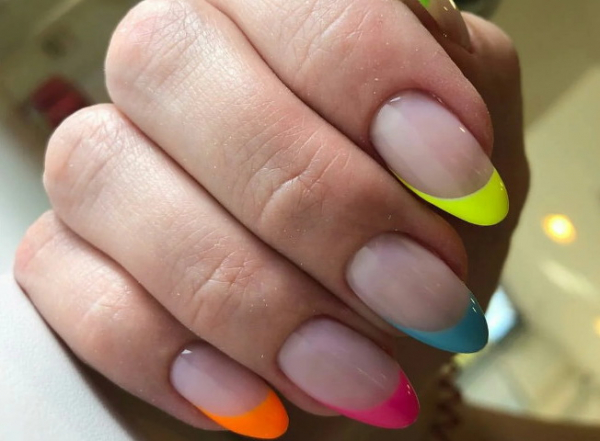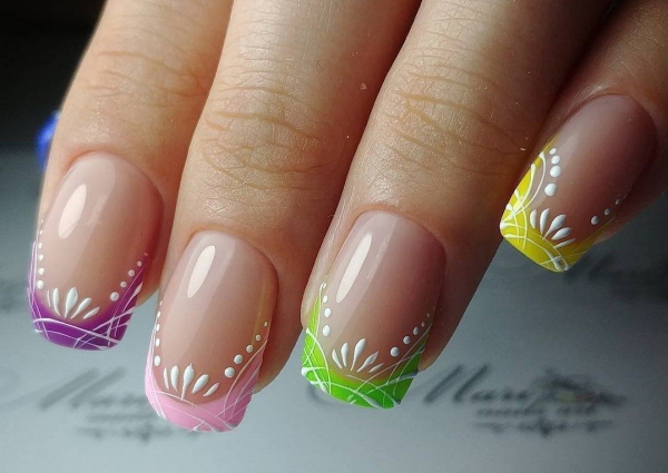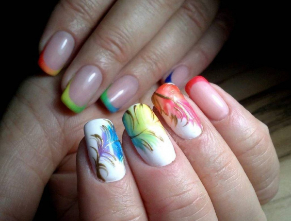Сочный вариант французского маникюра отлично подходит для пляжного отдыха. Разноцветное покрытие в радужном стиле будет радовать хозяйку и поднимать настроение своей пестротой. Вариант сам по себе достаточно яркий, поэтому не стоит “перегружать” его дополнительным декором.