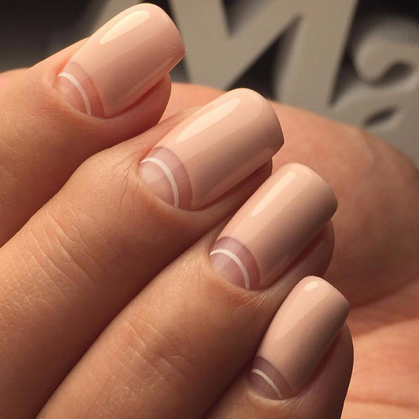 В этом популярном варианте основная линия, которая проводится вдоль кончика ногтя, подчеркивается еще одной полосой. Получается такая двойная улыбка. Акцент можно поставить двумя яркими цветами, или сочетанием яркого цвета и полоской из шиммеринга или глиттера.