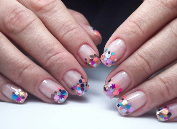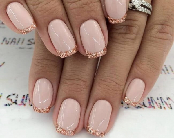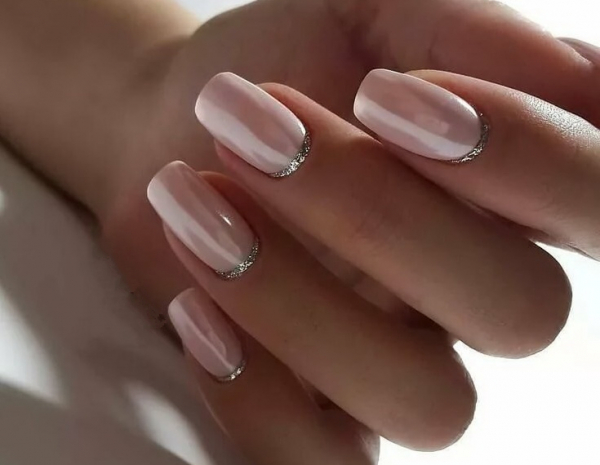 Много блеска не бывает, в особенности летом, когда так хочется выделиться и создать неповторимый образ. Сияние от глиттера, шиммеринга, металлических втирок и фольгирования прекрасно украсит любой вариант френча. Можно сделать точечные акценты, либо полностью сияющий маникюр.