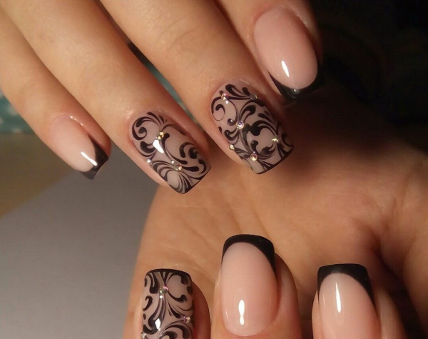 Кружевные завитки подойдут для романтического образа и в особенности для молодых барышень. Интересное сочетание — черное глянцевое кружево + матовое прозрачное покрытие, либо кружевные узоры + нюдовый глянец. Узорами можно покрыть как все пальцы, либо сделать акцент на нескольких.