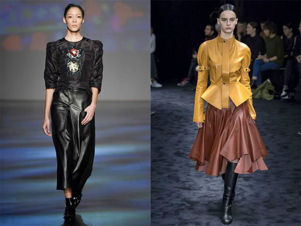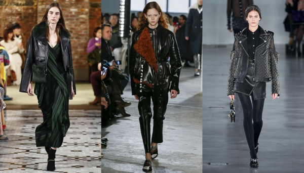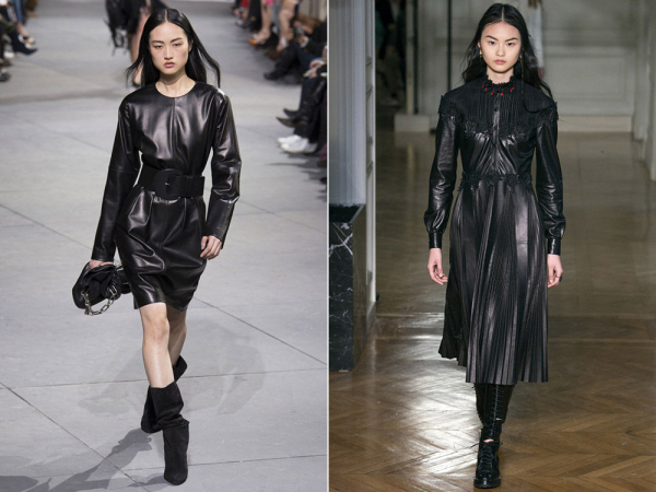 - Кожа. Кожа по-прежнему в тренде. Плащи, косухи, кожаные комбинезоны на манер авиаторских – все это будет актуально при составлении стильного образа предстоящей осенью. Однако дизайнеры по обе стороны Атлантики, не сговариваясь, отдали предпочтение максимально брутальному варианту этого тренда – черному цвету.