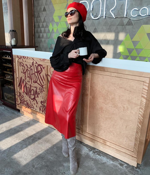 - яркую красную юбку лучше всего сочетать с черным верхом и неброскими аксессуарами;