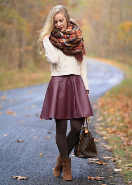 Комбинировать такую юбку можно с блузой или рубашкой, неплотным пуловером, вязаным свитшотом, прямым или объемным пальто.