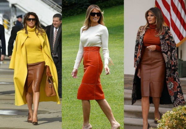 Чтобы правильно носить кожаную юбку карандаш можно взять пример с первой леди США. Мелания Трамп неоднократно появлялась на публике в прямых моделях, комбинируя их с водолазками, пальто и туфлями-лодочками.