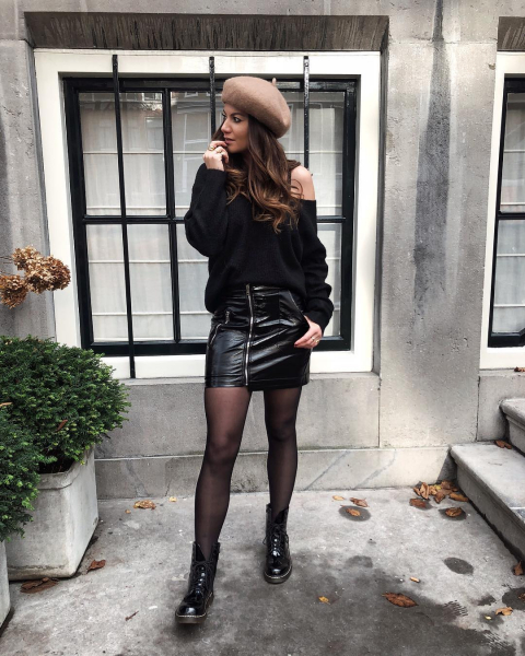 Интересно! Если соединить кожаную юбку с кружевной майкой, косухой и ботинками на грубой подошве, получится смелый образ в панк стиле.