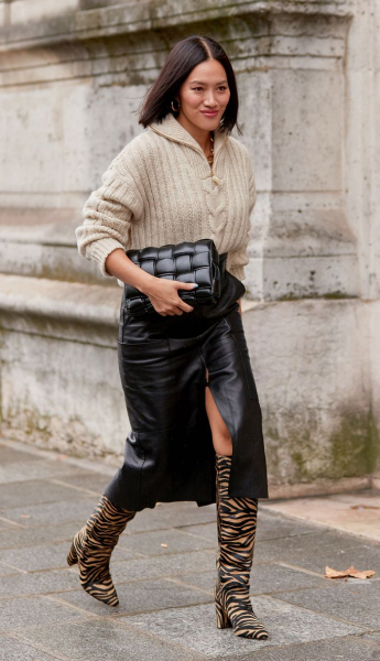Касательно обуви, то тут правит полная свобода. Носить кожаную мини можно со спортивной обувью, босоножками, ботильонами, высокими сапогами, туфлями на каблуке или низком ходу и даже резиновыми сапогами, все зависит от времени года и личных предпочтений модницы.