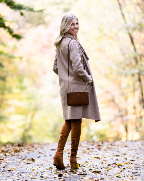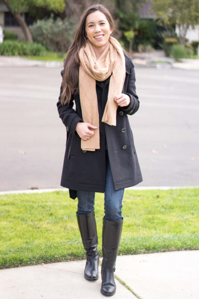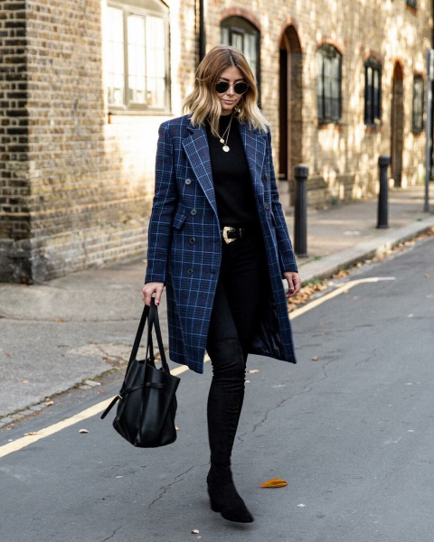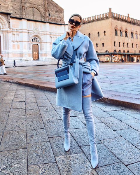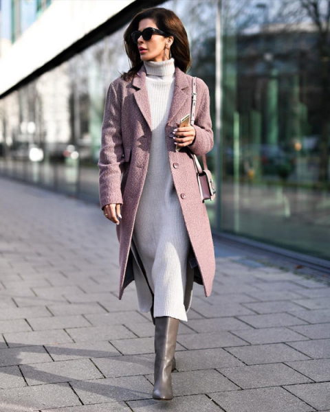 С пальто до колена можно носить обувь на тонком, толстом каблуке или плоской подошве. От погоды будет зависеть, составите вы образ с высокими или низкими сапогами, ботильонами, туфлями или босоножками.