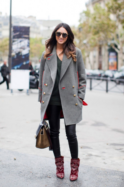 - Под серую модель. Это универсальный оттенок, который можно сочетать как с однотонными, так и цветными моделями. Коричневые сапоги, черные ботильоны и даже белые кроссовки прекрасно дополнят осенние и весенние луки.