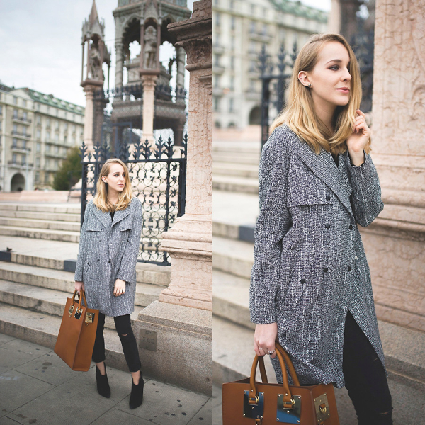 Однотонные образы выглядят достаточно просто. Если избежать одноцветности не получилось, можно попробовать поэкспериментировать с материалами и выработкой. Например, подобрать к черному пальто обувь из лаковой кожи.