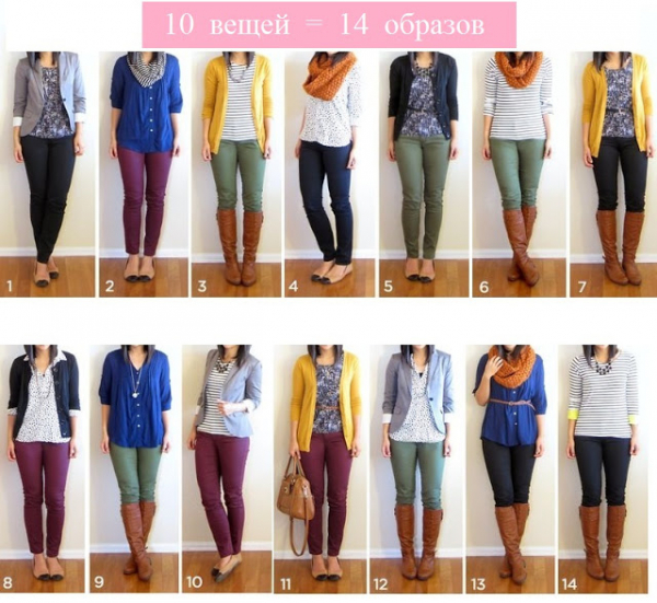 Обратите внимание! Распространенная ошибка при составлении капсульного гардероба – однотипность элементов верха, цветовых решений и принтов. Часто на картинках цельных луков можно увидеть пририсованные шарфики и колье, что создает иллюзию разнообразия. На деле же только шарф может реально поменять что-то в образе, потому как создаст другой вид ворота.