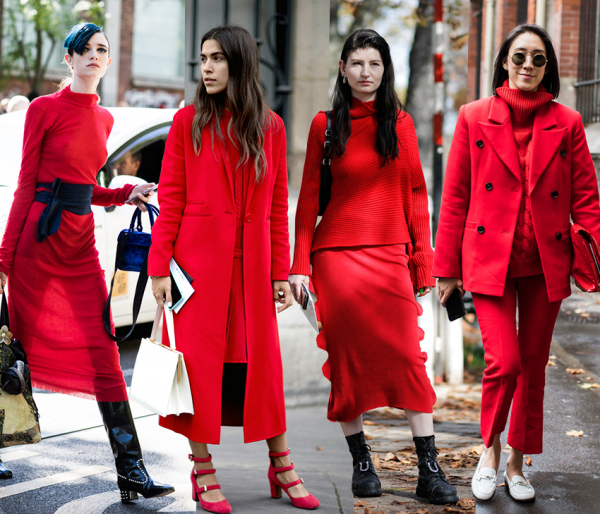 - Аутфиты в красном цвете. Стремитесь быть яркой всегда и везде – попробуйте монохромно-красный образ. Red total look – это наш ответ уже поднадоевшему total black. Сочетайте красные широкие брюки и удлиненным блейзером или длинной юбкой. Дополните пальто и вуаля!