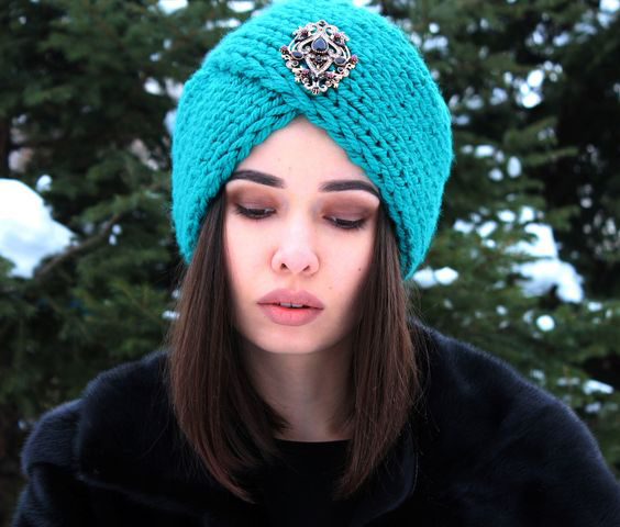 Многие современные модели шапок похожи одна на другую, чего не скажешь о стильной чалме. За ее уникальность отвечает узнаваемый восточный стиль и необычная форма. Для удобства модниц современные дизайнеры создали практичную шапочку с виду напоминающую чалму. Сегодня ее вяжут из достаточно плотной пряжи, декорируют брошью или булавкой.