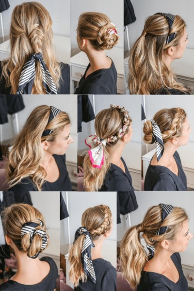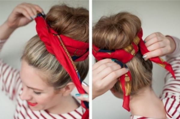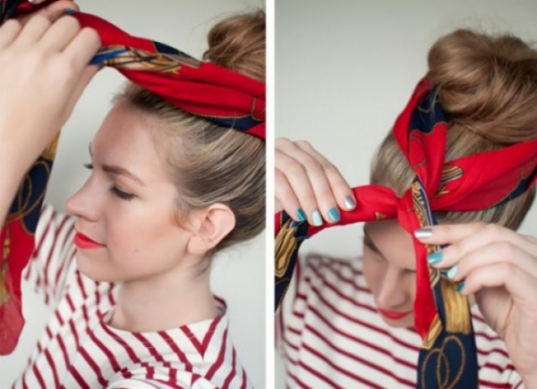 Также стильным аксессуаром можно обмотать пучок из волос или прическу «конский хвост». Просто оберните ткань вокруг и завяжите спереди или сзади на узел.