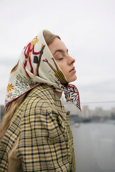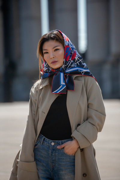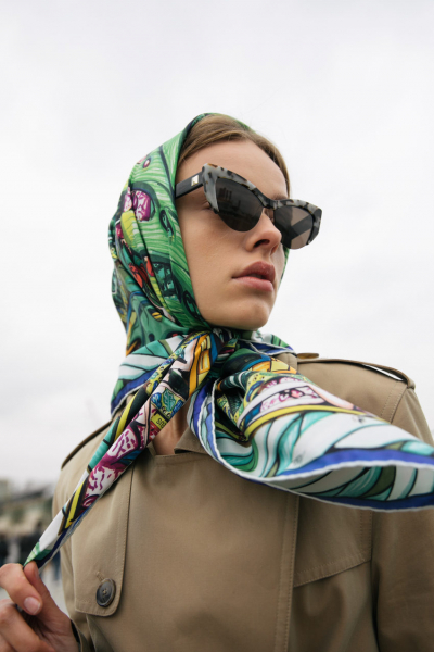 Аккуратно завязанный аксессуар не испортит укладку и при этом отлично защитит от непогоды. Для этого повяжите его свободной косынкой – сложите наискосок и накиньте на голову. Свободные концы затяните в нетугой узел ниже подбородка на уровне ключиц.