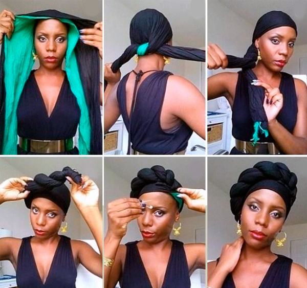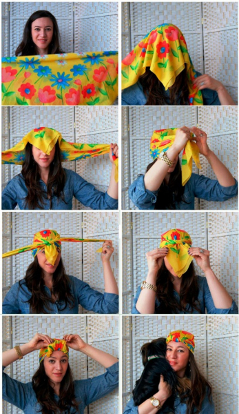 Сложите ткань по диагонали в полосу желаемой ширины. Оберните вокруг головы и завяжите аккуратным узлом.