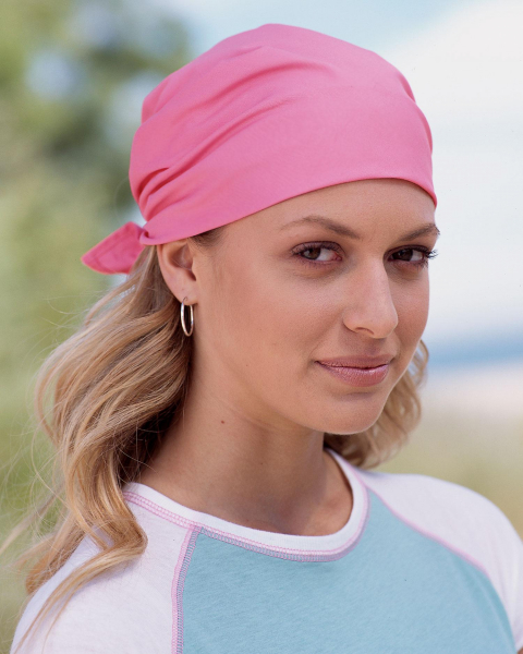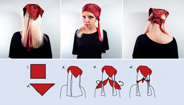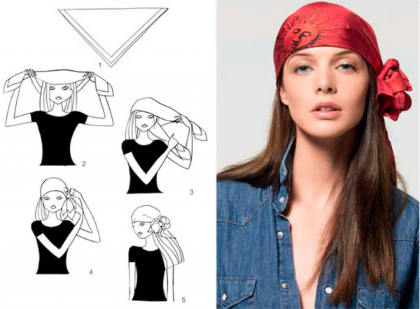 • По-пиратски. Достаточно простой способ завязывания. Такой головной убор отлично защитит от солнца в жаркие дни, а также отлично сочетается с солнцезащитными очками. Накройте голову изделием так, чтобы один угол оказался на лбу, а два других свисали по бокам. Свисающие края поднимите ко лбу и соедините с помощью узла поверх третьего. Затем третий край поднимите вверх и закройте им концы предыдущих, сделав стильную бандану.