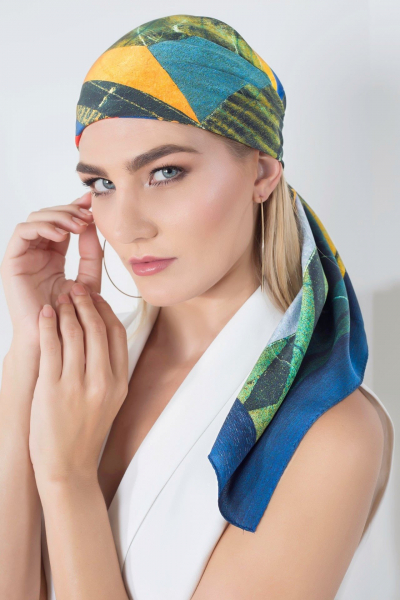 Подберите квадратное изделие достаточно больших размеров. Сверните его как косынку, набросьте средний край на голову так, чтобы он не касался лба. Перекрестите свободные края треугольника, переведите их назад, затем свяжите небольшим узлом.