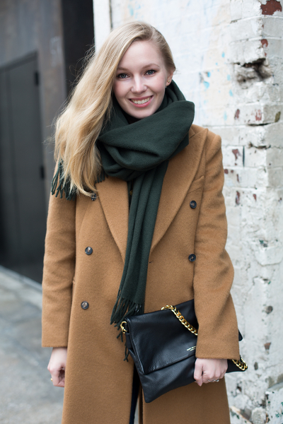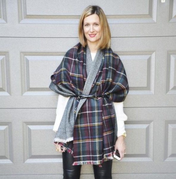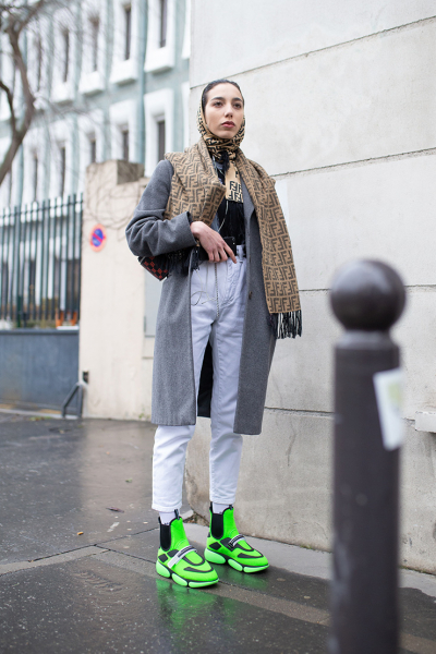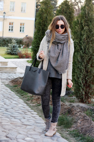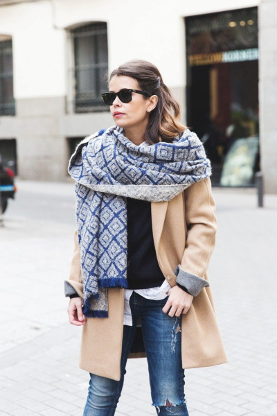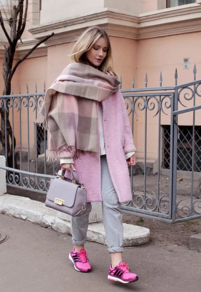 - Объемный шарф прекрасно сочетается с верхней одеждой оверсайз и вещами в полуспортивном стиле, например, свитером, брюками и кроссовками.