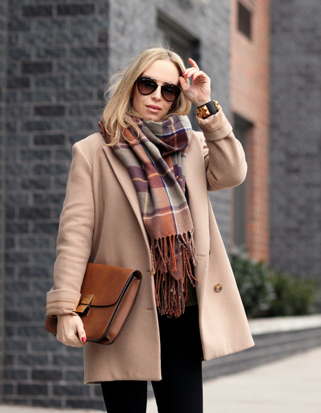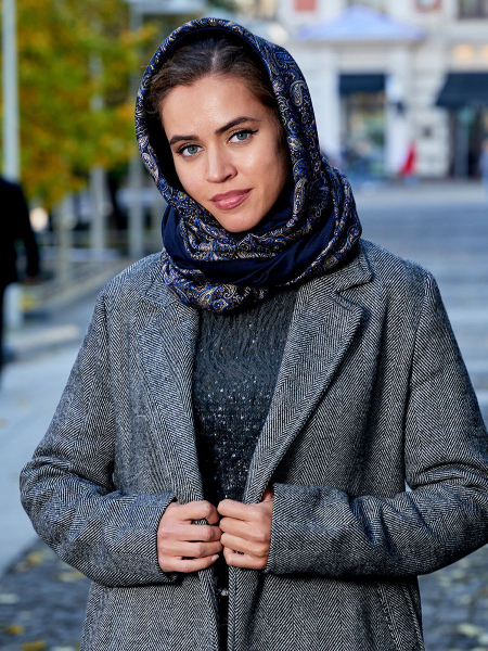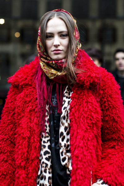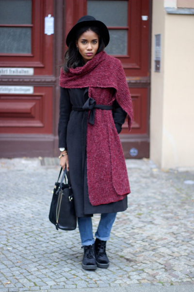 - Свободный объемный аксессуар, завязанный поверх пальто, отлично комбинируется с широкими шляпами. Получается женственный и невероятно элегантный образ.