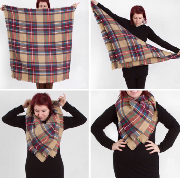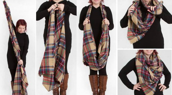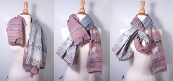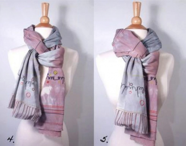 №11. Если проявить немного фантазии, можно создать из шарфа настоящую бабочку. Накиньте изделие на шею. Перекрутите дважды на уровне груди. Края закрепите на плечах с помощью булавок, аккуратно расправьте. Ниже представлена пошаговая инструкция и итоговый результат, который должен получиться в ходе манипуляций с шарфом.