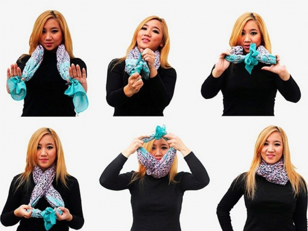 Аксессуаром также можно покрыть голову на манер капюшона, перекрестив края на шее и закинув их назад. Чтобы такая шапочка не спадала с головы, можно затянуть концы в узел, как платок.