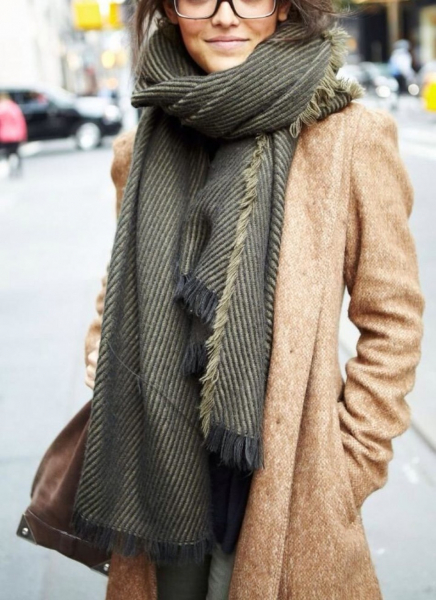 - лучше всего комбинировать шарф с пальто со стоячим воротником или вообще без него;